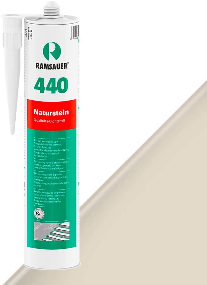 Ramsauer Naturstein 440, 310 ml, rouge-brun est un mastic d'étanchéité spécialement conçu pour le jointoiement des pierres naturelles telles que le marbre, le granit, le terrazzo, etc. Contrairement aux mastics silicones traditionnels, il n'y a pas d'encrassement des bords au contact de ces matériaux de construction. NATURSTEIN 440 contient des agents fongicides et bactéricides et résiste aux produits de nettoyage et de désinfection usuels. NATURSTEIN 440 convient pour une utilisation dans les joints fortement sollicités ainsi que dans les zones immergées.