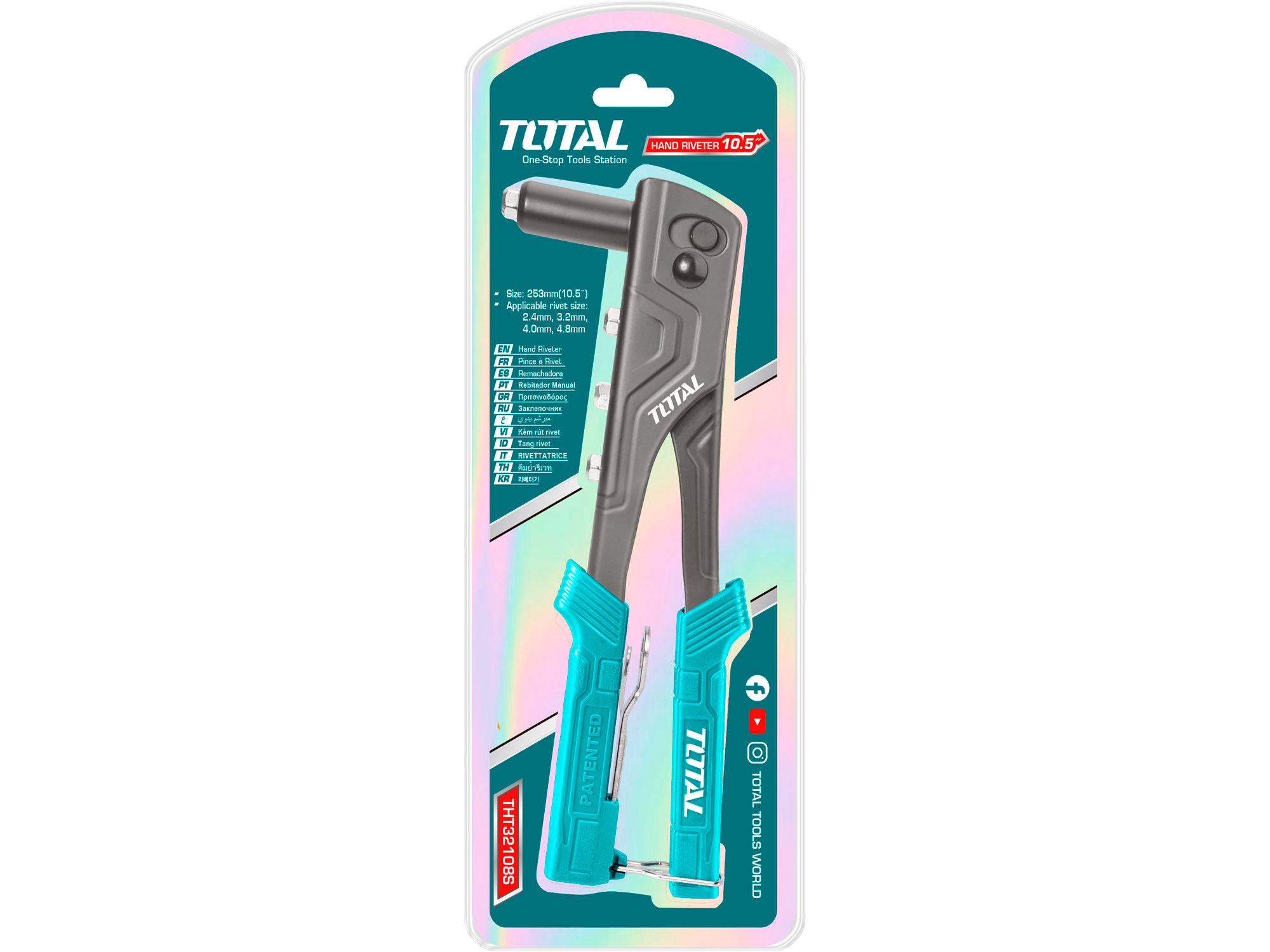 - Avec sa longueur de 270 mm, elle offre une bonne course de levier pour retirer les rivets les plus serrés sans trop d'effort. - La pince à riveter est adaptée à différentes tailles de rivets, notamment 2,4 mm, 3,2 mm, 4 mm et 4,8 mm. - Elle dispose d'une poignée antidérapante pour une prise en main sûre pendant le travail. - La pince est idéale pour les artisans et les bricoleurs qui travaillent régulièrement avec des rivets. - Elle est légère et compacte, ce qui la rend idéale pour une utilisation mobile. - La pince à riveter est facile à utiliser et permet d'économiser du temps et des efforts par rapport au rivetage manuel. - Elle convient à une grande variété de matériaux, y compris le métal, le plastique et le cuir. - La pince à riveter de Total vous permet de poser ou d'enlever vos rivets avec précision et efficacité. Fabricant