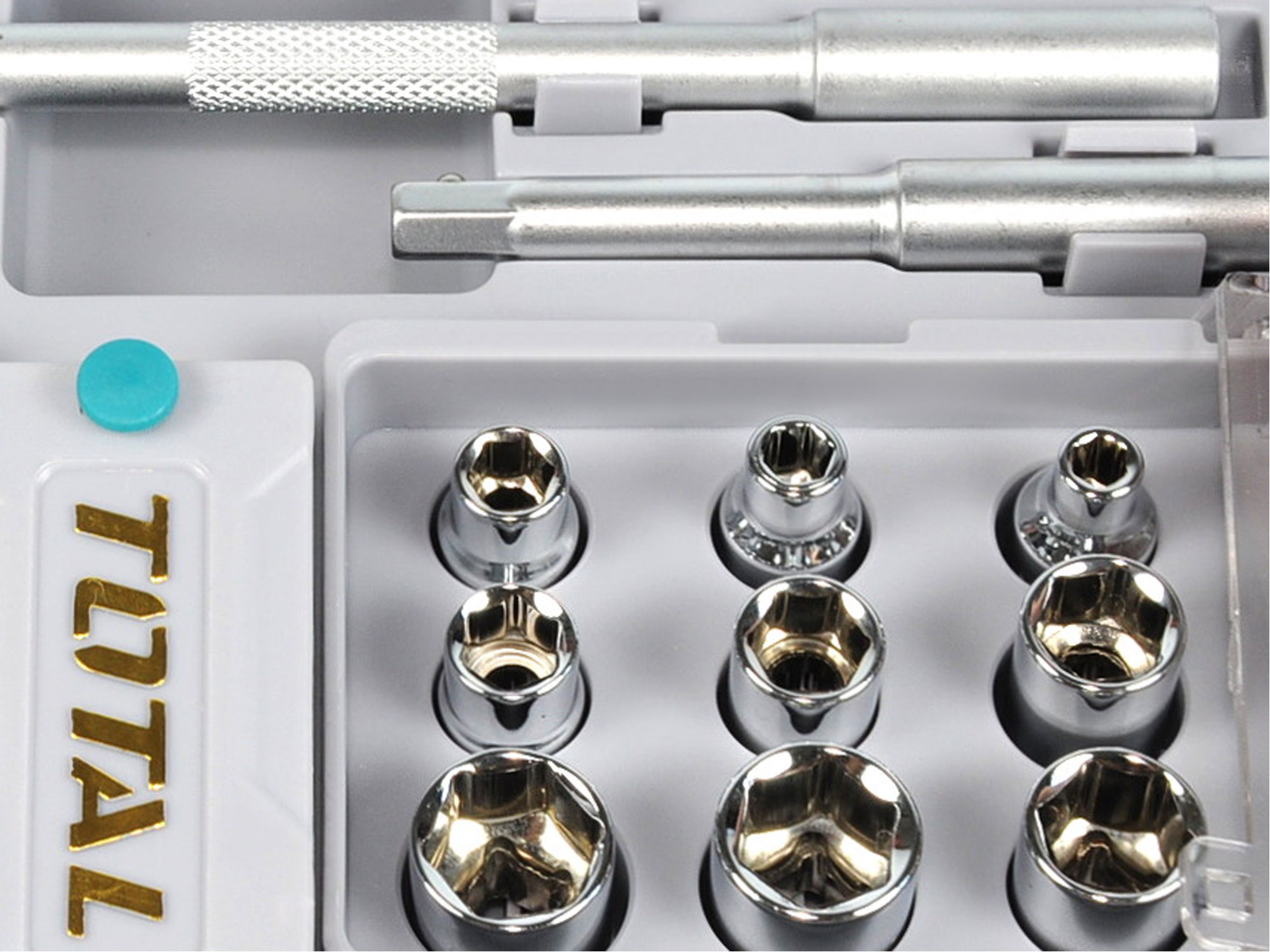 Toutes les pièces sont soigneusement emballées dans une boîte design TOTAL. Cette boîte est robuste et compacte, elle se glisse donc facilement dans une caisse à outils et vous pouvez l'emporter partout avec vous.