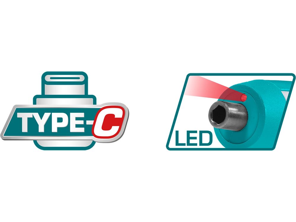 - Recharge USB - Avec jeu d'embouts TOTAL - Éclairage par LED - Interrupteur de couple et affichage du couple par LED - Rotation à gauche et à droite - Design compact et maniableContenu de la livraison :
