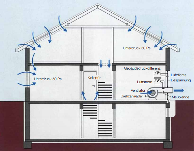 Principe de la mesure de la perméabilité à l'air. Lorsque les fenêtres et les portes sont fermées, la vitesse de rotation du ventilateur est augmentée jusqu'à ce qu'une différence de pression soit atteinte. différence de pression du bâtiment de 50 Pa par exemple. Le débit volumétrique à lire est appelé débit volumétrique de perméabilité à l'air .