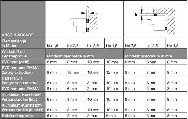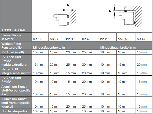Le tableau ci-dessous a été élaboré par l'ift Rosenheim afin de garantir un minimum d'erreurs lors du dimensionnement des bandes d'étanchéité précomprimées . En comparant le tableau 1 au tableau 2, il apparaît clairement que l'utilisation de bandes d'étanchéité permet de réduire la largeur du joint par rapport aux mastics d'étanchéité pâteux. Il s'agit là d'un avantageéconomique évident pour les bandes d'étanchéité.