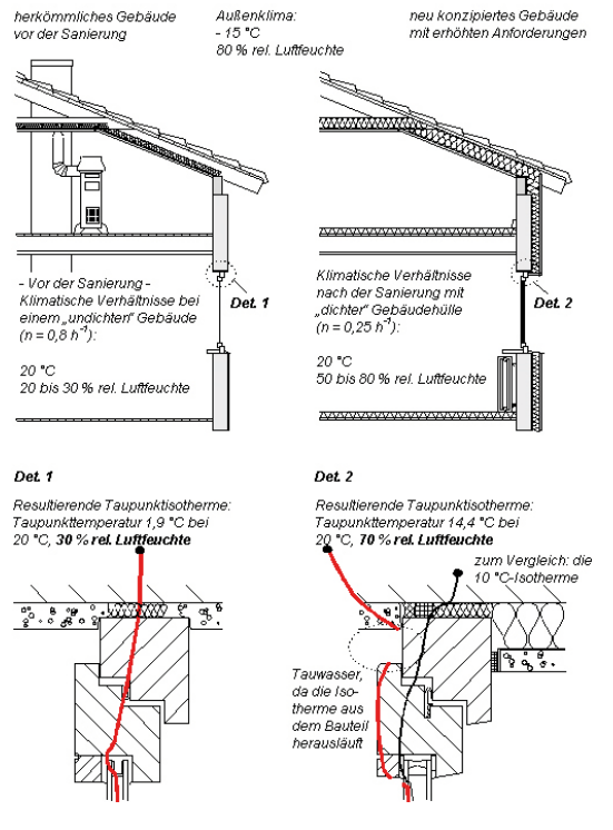 Si, comme mentionné au chapitre 6, la température de l'élément de construction baisse et que l'air ambiant n'est plus en mesure d'absorber l'humidité produite, de la condensation se forme. Une température de 12,6 ºC s'est avérée critique. Au moyen d'un logiciel spécial, les températures de surface sont déterminées dans un raccordement de construction et reliées en une ligne, appelée courbe isotherme.